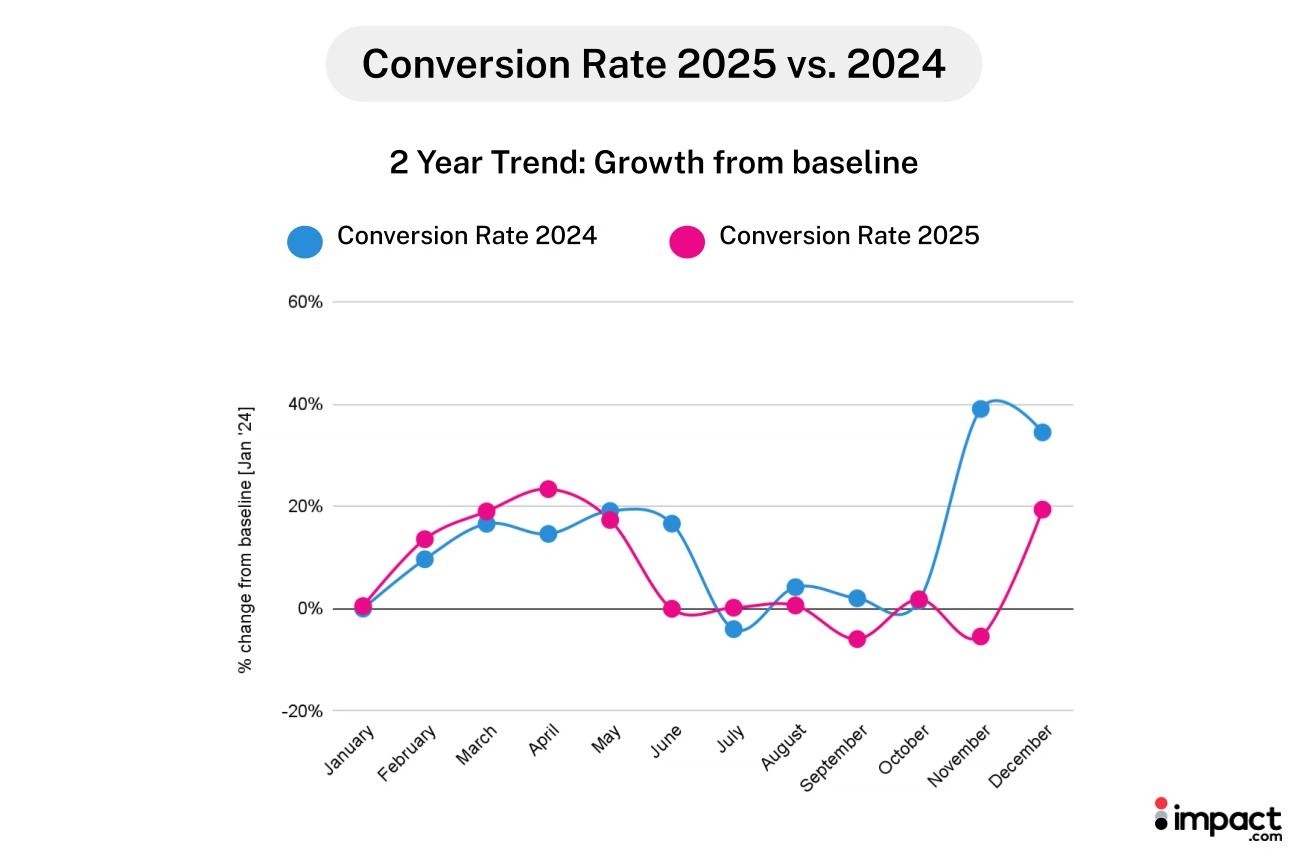 impact.com关于合作伙伴营销渠道在3、4月表现的调研数据,则从另一侧印证了这一逻辑:在缺少大促干扰、信息噪音更低的月份,流量意图最纯粹,转化率反而跑出了全年高点。这说明消费者的购买意愿并未减弱,只是被大促周期重新塑造了节奏。